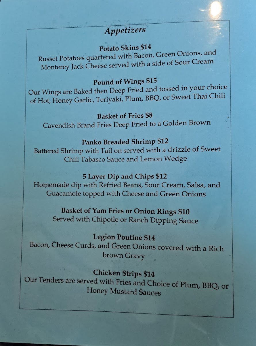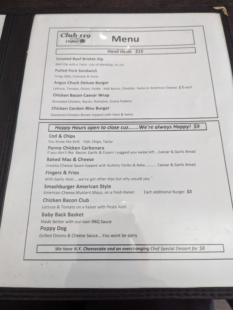 The menu at Port Moody Legion Club 119 offers a straightforward selection of comforting, casual bites and a modest range of drinks designed to complement its unpretentious atmosphere. It’s the kind of place where you can enjoy familiar, satisfying meals like a classic turkey sandwich or a hearty bowl of seafood chowder alongside cold, easygoing choices such as mimosas or well-poured beers.